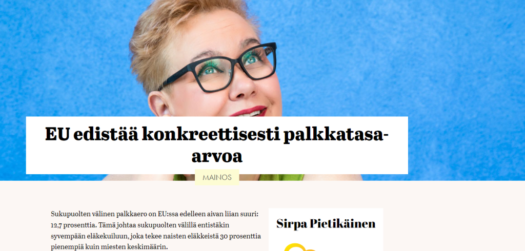 Vajaa vuosi sitten joulukuussa 2022 Euroopan parlamentti ja EU-jäsenmaat saavuttivat neuvotteluissaan sovun EU:n palkka-avoimuusdirektiivistä. Direktiivi on merkittävä askel eteenpäin sukupuolten välisen palkkakuilun sulkemisessa, koska ilman tietoa emme voi poistaa syrjintää.