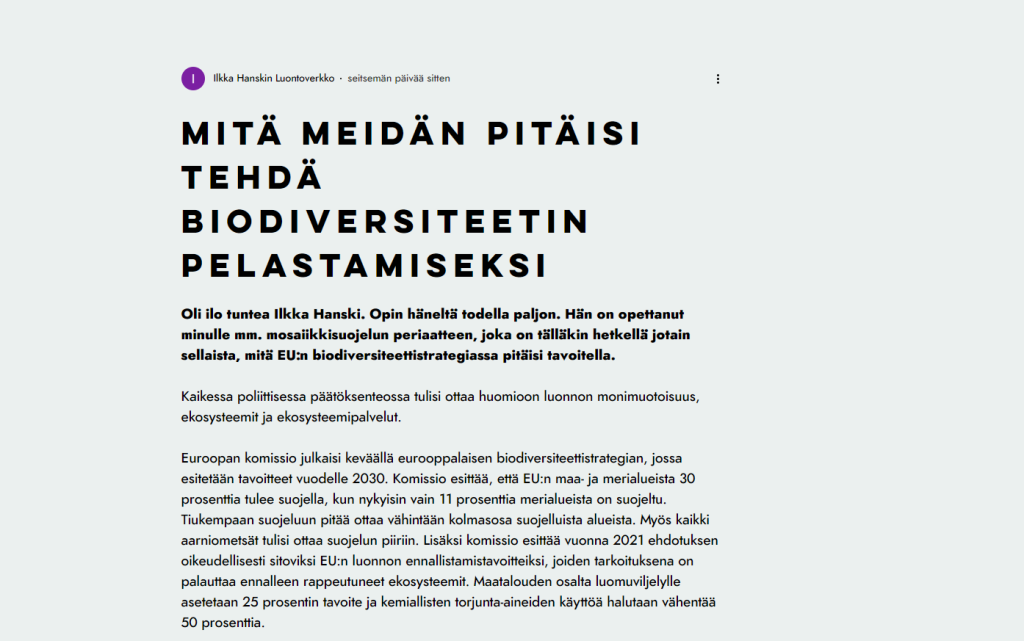 Kirjoitus on julkaistu alunperin Ilkka Hanskin luontoverkko -blogissa 11. marraskuuta 2020.