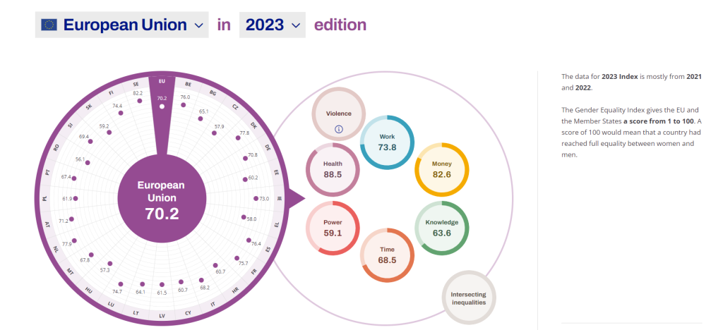 Tasa-arvo edistyy EU:ssa madellen. Tänä vuonna EU:n pistemäärä on 70,2, joka on 1,6 enemmän kuin viime vuoden indeksissä. Luku 100 edustaisi mittauksessa täyttä tasa-arvoa. Kokonaisluku EU:ssa ylitti ensimmäisen kerran 70 pisteen rajan, mikä on tietenkin iloinen asia. Olemme kuitenkin Euroopassa yhä kaukana sukupuolten tasa-arvosta.